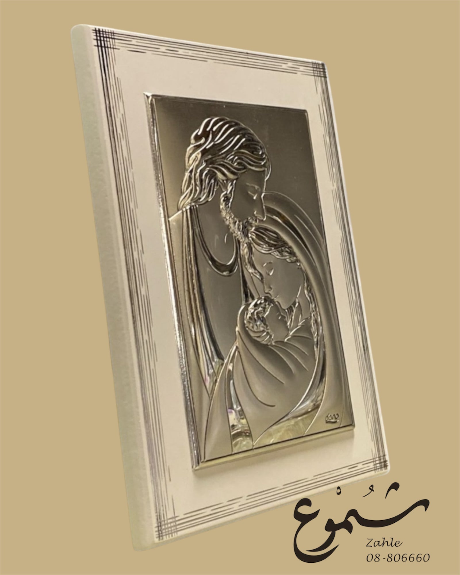This elegant silver-plated plaque features a beautifully detailed depiction of the Holy Family—Joseph, Mary, and Baby Jesus. The intricate craftsmanship and reflective silver-tone finish make it a perfect religious keepsake.