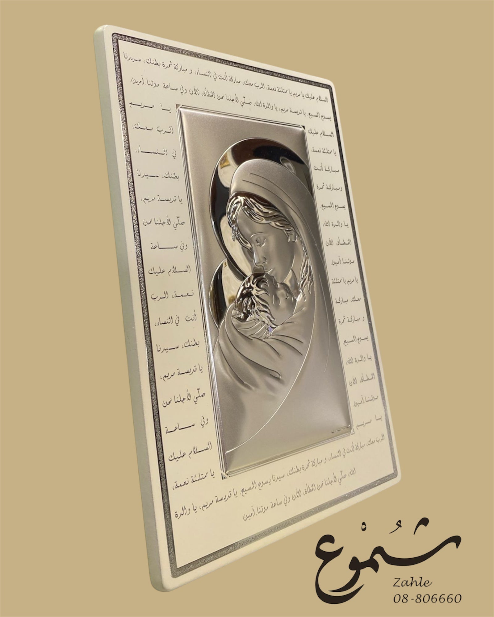 This stunning silver-plated plaque features an elegant relief of the Virgin Mary lovingly embracing Baby Jesus. Surrounding the image is an intricately inscribed Arabic prayer, enhancing its spiritual significance. This sacred artwork is a meaningful addition to any home, church, or prayer space.